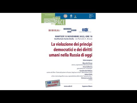 Martedì 15 novembre 2022 alle ore 18 presso l’Auditorium Santa Giulia in Brescia, via Piamarta 4, vi è stato un incontro sul tema: “La violazione dei principi democratici e dei diritti umani nella Russia di oggi”. Sono intervenuti: Marcello Flores (già docente di Storia contemporanea nell’Università di Siena, dove ha diretto anche il Master in Humain Rigthts and Genocide Studies, membro di Memorial Italia), Anna Zafesova (giornalista de “La Stampa, di cui è stata corrispondente da Mosca, vincitrice del Premio Cerruglio 2022, il concorso letterario nazionale di saggistica d’attualità, con il suo saggio Navalny contro Putin), Carolina De Stefano (autrice per la Morcelliana del libro Storia del potere in Russia. Dagli zar a Putin – 2022), Anton Dolin, il più celebre critico cinematografico russo, caporedattore della rivista Isskustvo kino (Arte del cinema) e editorialista del portale Meduza, che ha lasciato la Russia dopo l’invasione dell’Ucraina, e l’artista Victoria Lomasko.